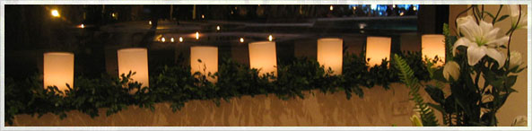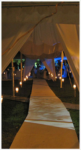 Romántica decoración con velas; fijas en los pasillos y alrededor de los toldos de la recepción. A escoger.